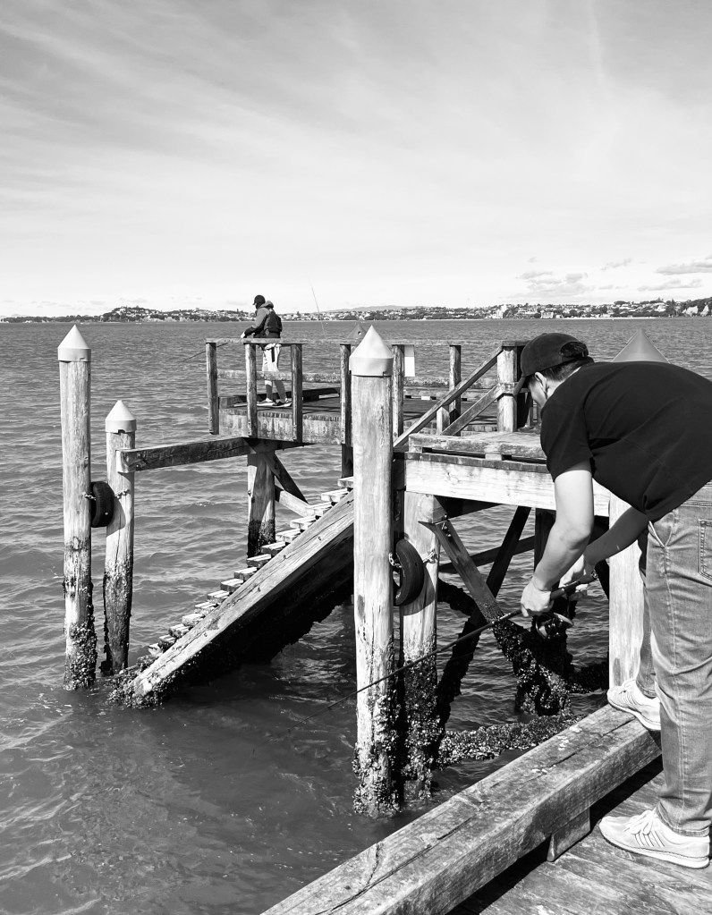 …images of the underside of wharves are recurring favourites of mine. in my mind they are places of transition, neither totally in sky or sea. transition from one thing to another is not always easy…as the stark criss-cross lines and encrusted beams in this photo allude to. periods of transition are never our destination but need to happen sometimes in order to get where we mean to go…