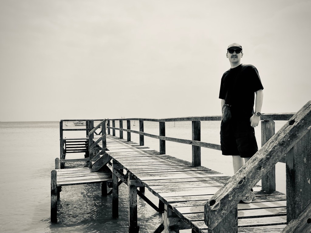 A young man stands on a wharf on Victoria’s Mornington Peninsula.
