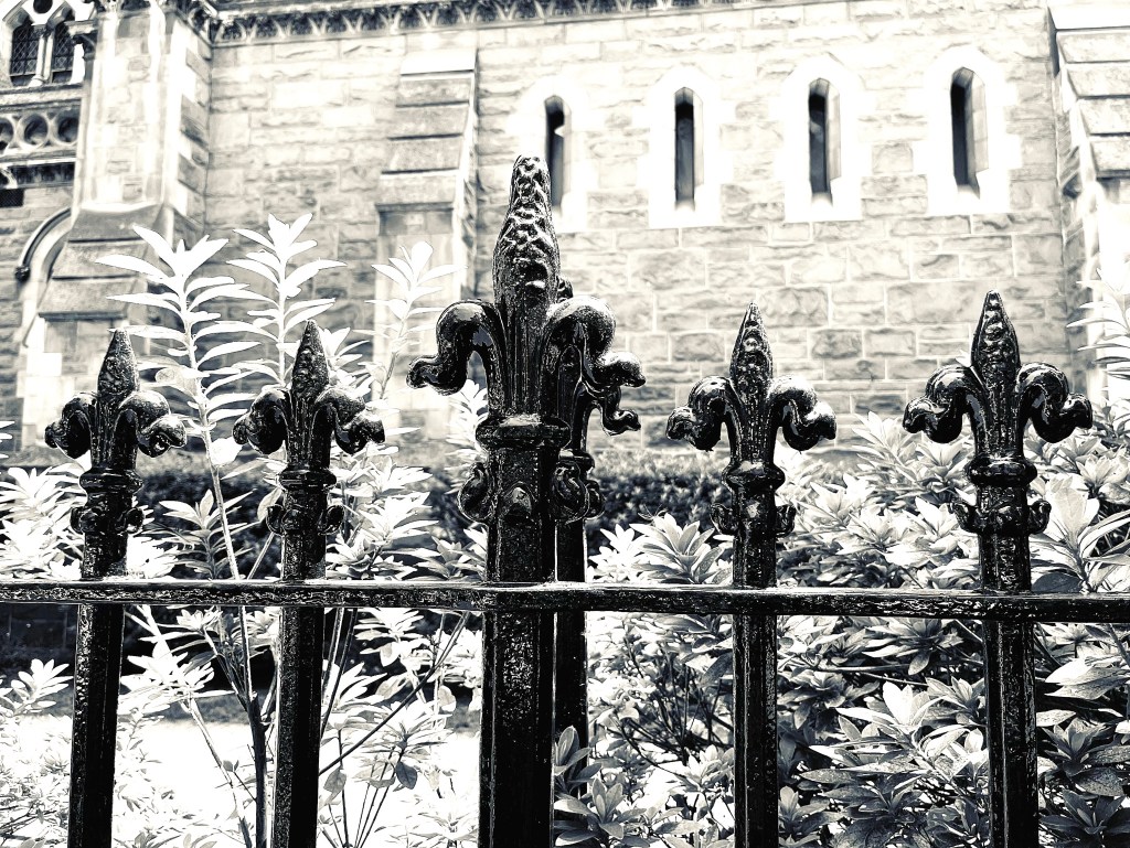 …sure, they may be in the shape of fleurs-de-lys, and may sit outside a church, but one climbs this fence’s prongs at own peril…