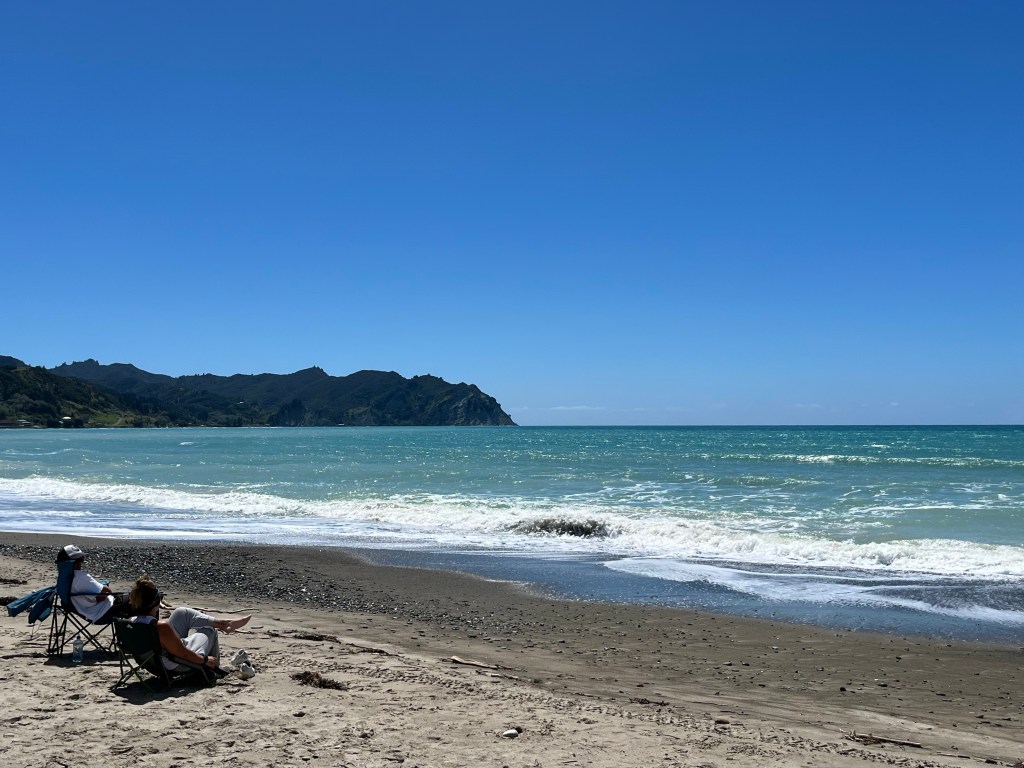 …a family play in the sand on Whangamata’s ocean page, next to a swim flag…