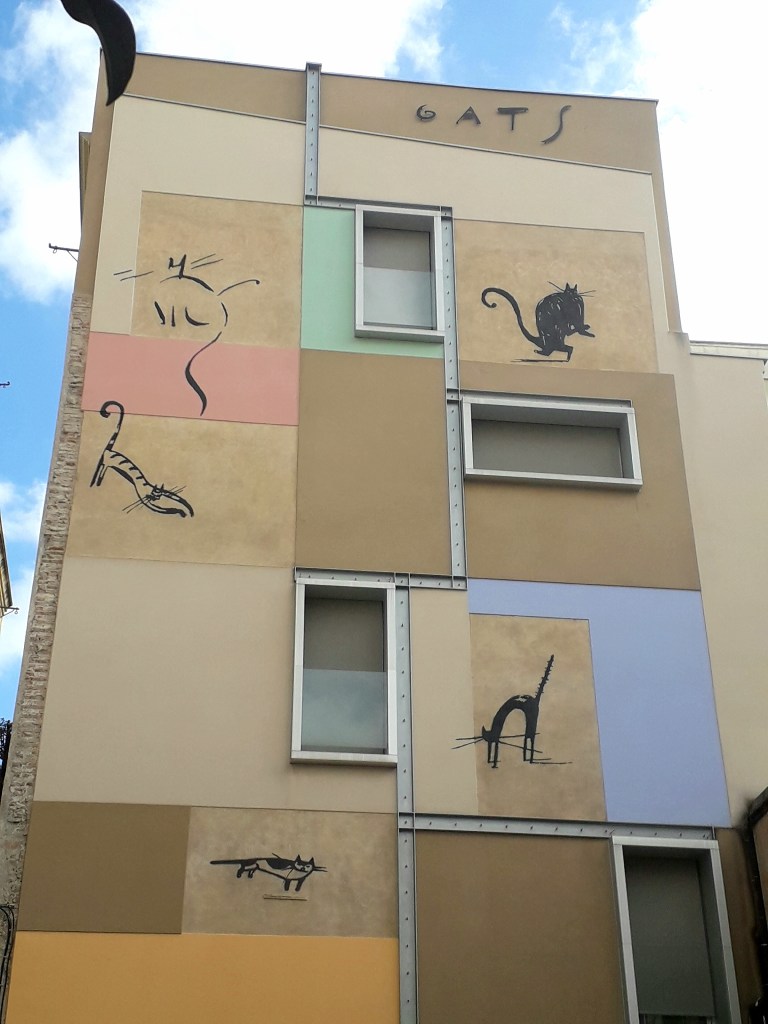 This shot was taken in Barcelona late last year. I was taken by the varied cat images and soft colour geometric highlights on the wall of a central city building.