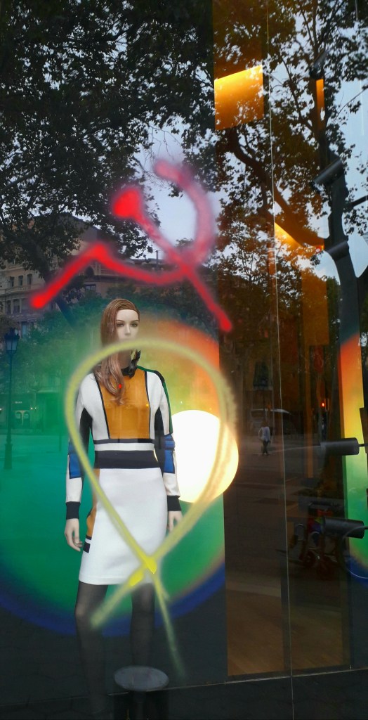 A mannequin is unmoved as a fashion store window is daubed with a red hammer and sickle and a yellow freedom protest ribbon. Leafy trees and the sky are reflected in the window, giving a sense of calm in the general unrest.
